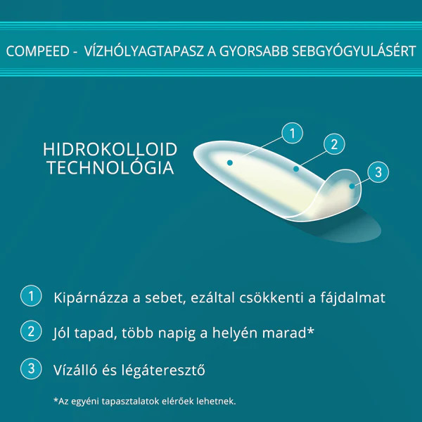 A Compeed® hidrokolloid technológia egy aktív gél nedvszívó részecskékkel. A Compeed® tapasz úgy viselkedik, mint egy második bőr, ezáltal támogatja a természetes nedvességegyensúlyt: