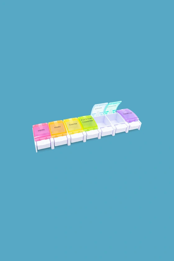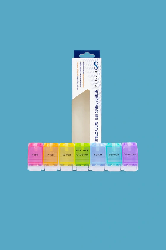 Az Elysium nyomógombos gyógyszeradagolója a hét minden napjára különböző színű rekesszel rendelkezik megkönnyítve a heti gyógyszeradag kiosztását.