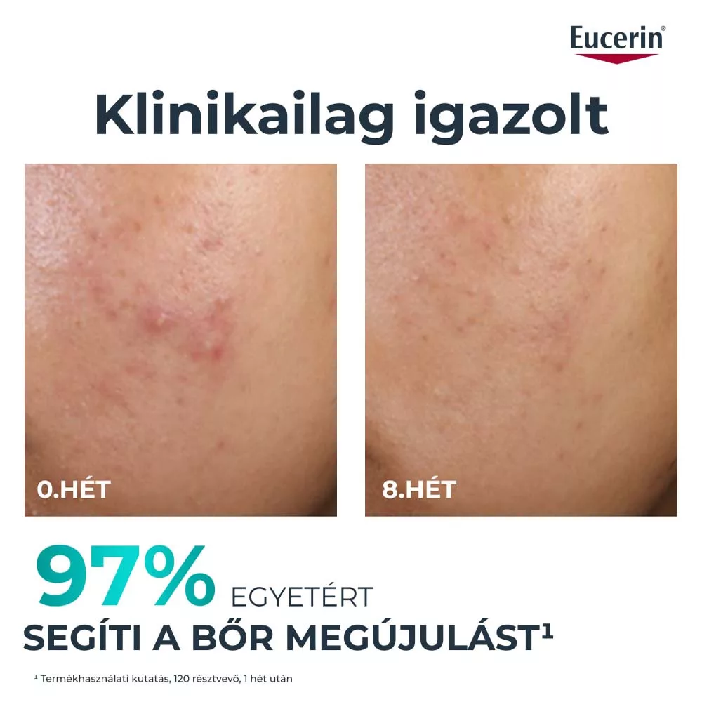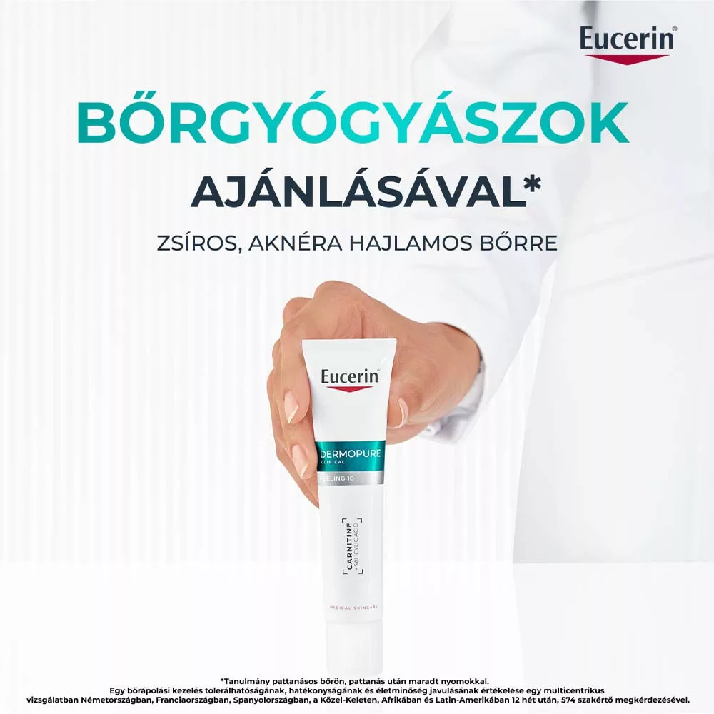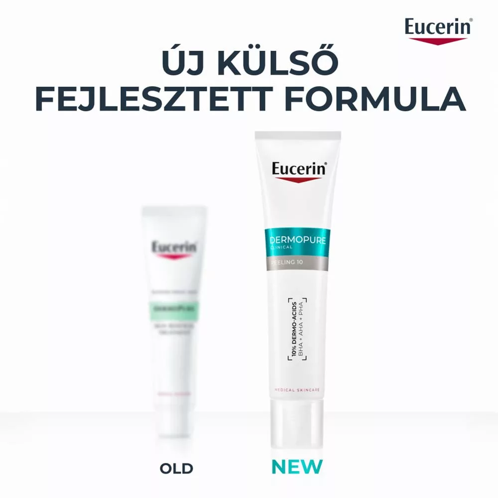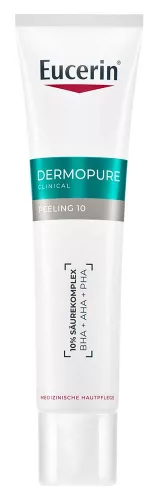 Az Eucerin Dermopure Clinical Peeling 10 Szérum (40 ml) magas koncentrációban kombinálja az AHA (pl. glikolsav), BHA (szalicilsav) és PHA (glükonolakton) savak hámlasztó erejét, melyek segítik az elhalt hámsejtek eltávolítását, a bőrfelszín megújulását és a bőrhibák csökkentését. A licochalcone A (édesgyökér-kivonat) gyulladáscsökkentő hatással nyugtatja a bőrt. Megfelelő árnyalatot és ragyogást biztosít a pattanásos, egyenetlen bőrnek.