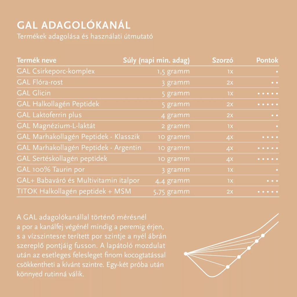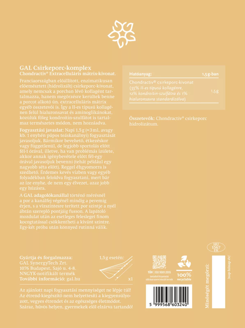 GAL Csirkeporc-komplex - Franciaországban előállított, enzimatikusan előemésztett (hidrolizált) csirkeporc-kivonat. A II-es típusú kollagénen felül hialuronsavat és aminoglikánokat, közülük főleg kondroitin-szulfátot is tartalmaz természetes módon, nem hozzáadva.