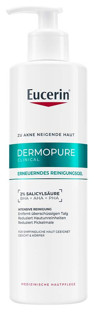 A Eucerin Dermopure Clinical Correcting Cleanser egy dermatológiailag ajánlott tisztító gél, amely már az első alkalmazástól csökkenti a pattanásokat és bőrhibákat felületesen és hatékonyan. A 2 % szalicilsav (BHA) mélyen tisztítja a pórusokat, míg az AHA + PHA kombináció segít az elhalt hámsejtek eltávolításában és a bőrtónus egyenletesebbé tételében. Nem szárít és nem csípi a bőrt, még érzékeny arcfelületen sem.