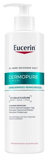 A Eucerin Dermopure Clinical Correcting Cleanser (400 ml) egy habzó arctisztító, mely 2 % szalicilsavat és AHA/PHA hámlasztó komplexet tartalmaz. Hatékonyan csökkenti a pattanásokat, mitesszereket és aknés hegeket már az első használattól. Illat-, szappan- és olajmentes, így gyengéd, mégis mélytisztító hatású minden bőrtípus számára, arcra és testre egyaránt.