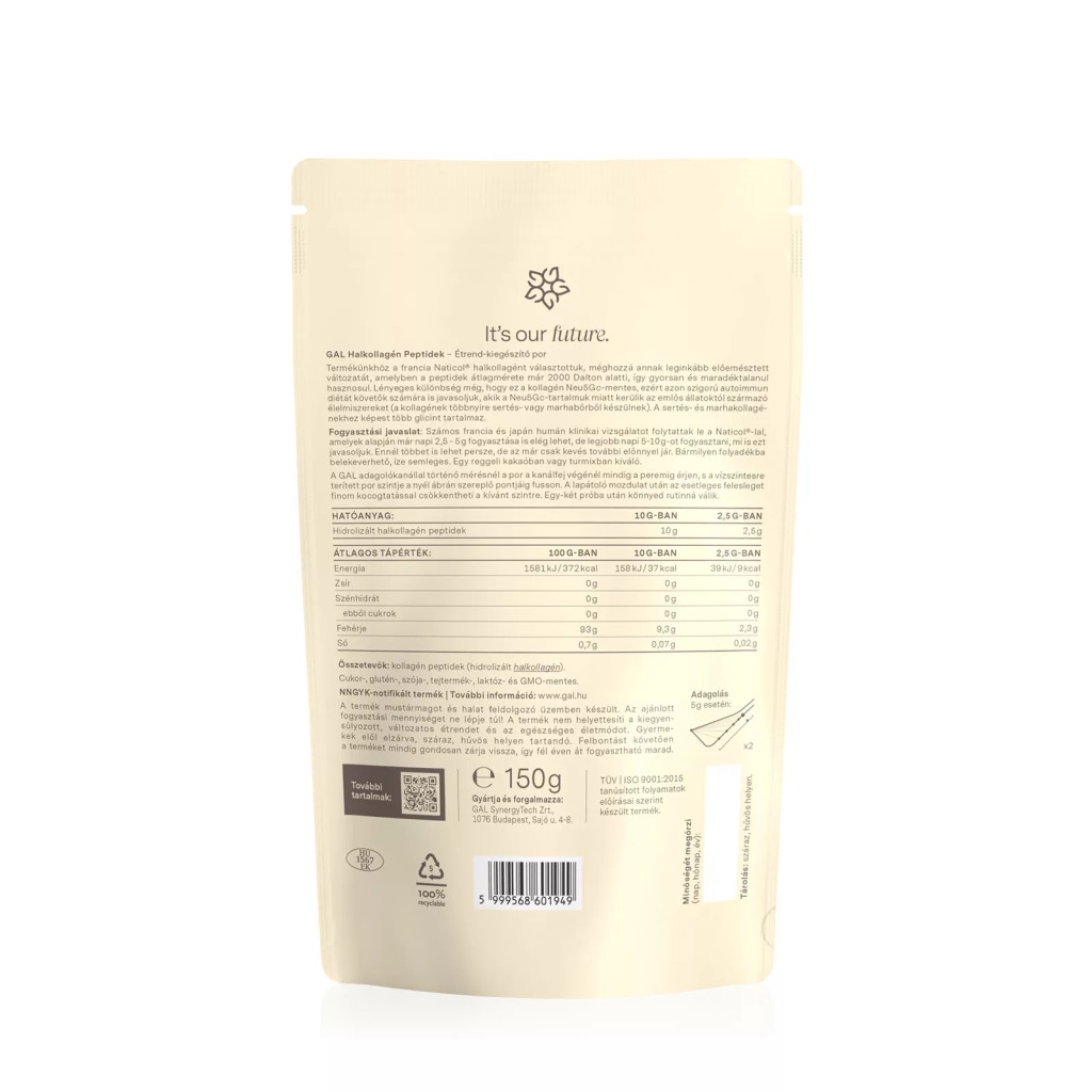 GAL Halkollagén Peptidek - Neu5Gc-mentes, 2000Dalton alatti peptidméretű, közel 100%-ban hasznosuló, extra minőségű halkollagén. Napi 2,5 – 5 g fogyaszása is elég lehet, de legjobb napi 5-10 g-ot fogyasztani, mi is ezt javasoljuk.